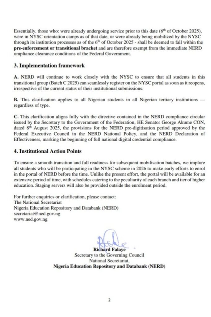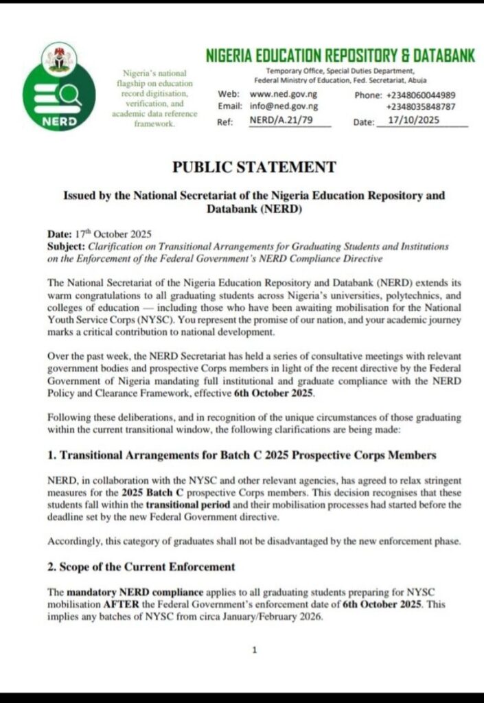 The Nigeria Education Repository and Databank (NERD) has issued a clarification on the enforcement of the Federal Government’s NERD Compliance Directive, assuring graduating students under the 2025 Batch C National Youth Service Corps (NYSC) mobilisation will not be affected by the new compliance policy.