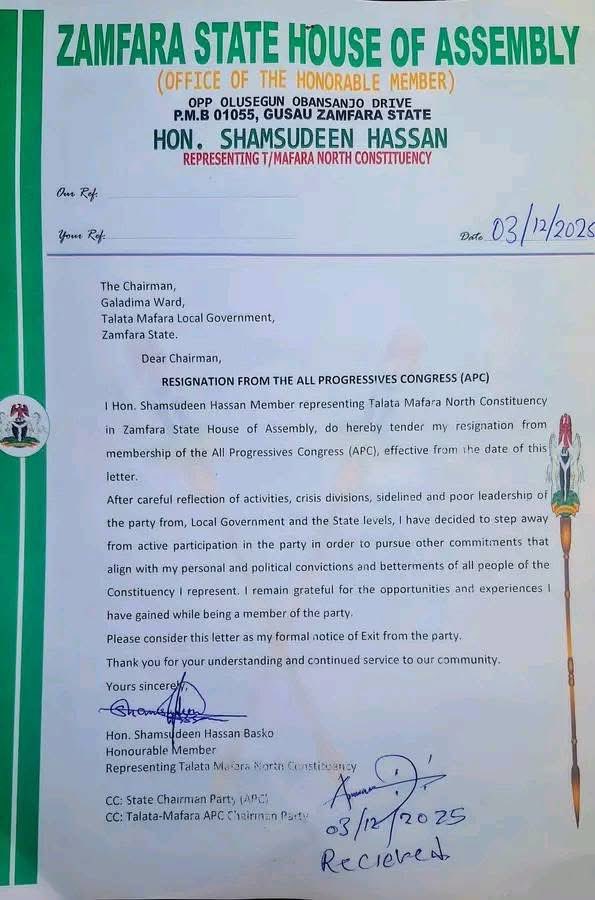 Mr Hassan told the ward leadership to consider the letter as his formal notice of exit from the APC, noting that he had forwarded the letter to the Zamfara State APC chairman and Talata Mafara Local Government APC chairman.