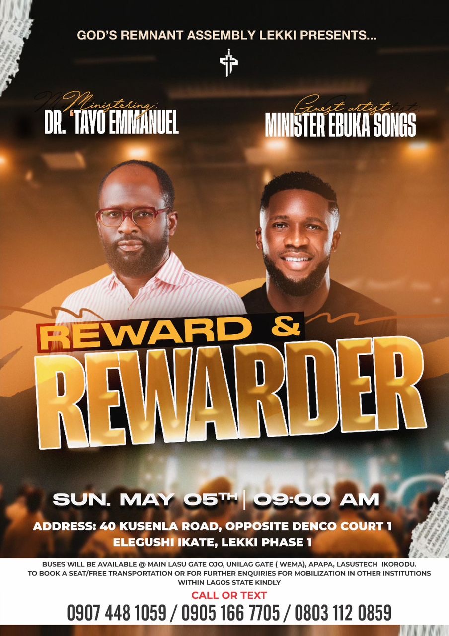 God’s Remnant Assembly Lekki is preparing to illuminate minds and uplift spirits with their forthcoming one-day power-packed program, titled “Reward & Rewarder.” Set to take place on Sunday, May 5th, at 9 am, the event promises a soul-stirring experience at 40 Kusenla Road, opposite Denco Court 1, Elegushi Ikate, Lekki Phase 1.